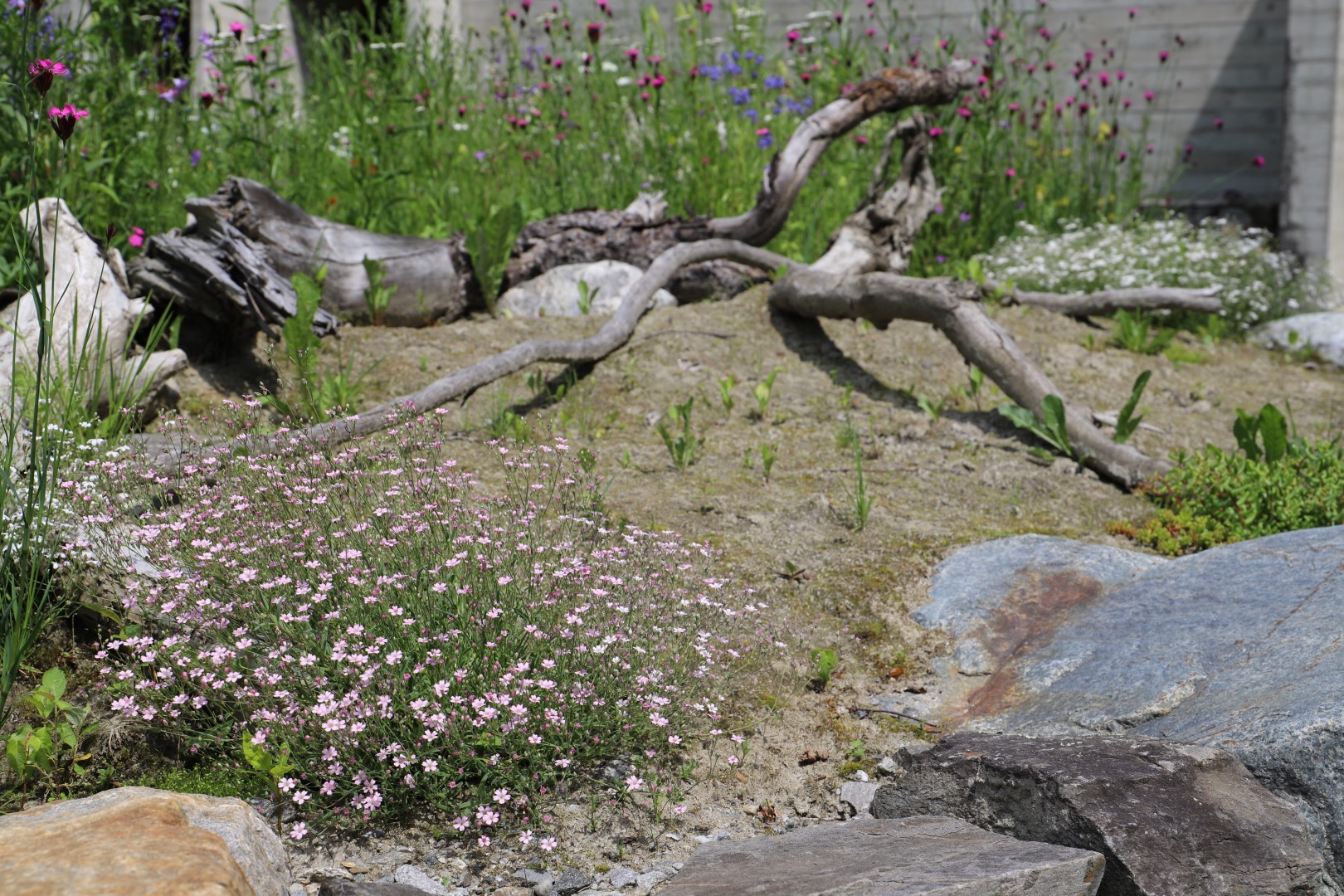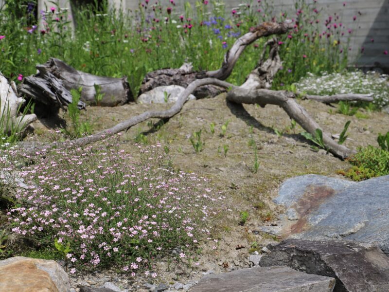 Trockensteinmauern, Totholz, Teich, Sandarium, Benjes-Hecke. Vielfältigste Lebensräume entstehen hier direkt vor dem Eingang zum Naturparkhaus.